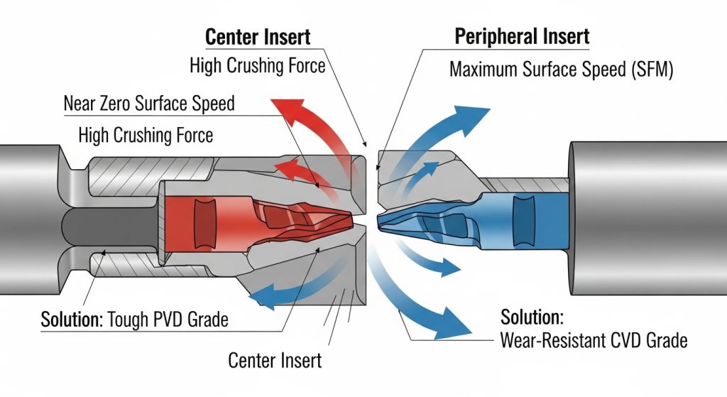 Indexable drills typically use two inserts: a Central (Inner) insert and a Peripheral (Outer) insert. Physics dictates that these two positions experience vastly different forces.