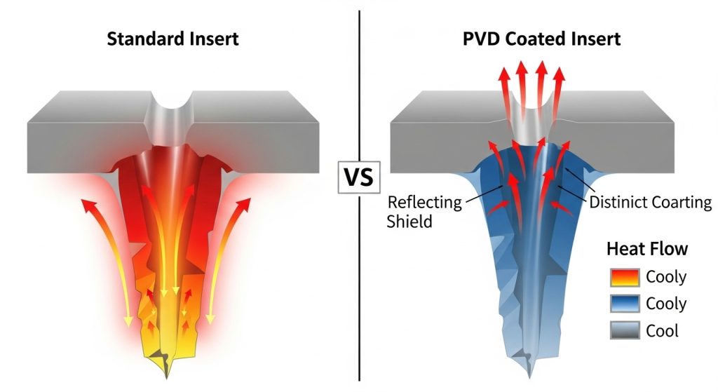 The coating is your heat shield. For drilling stainless, Physical Vapor Deposition (PVD) coatings are almost universally superior to CVD (Chemical Vapor Deposition). PVD coatings are thinner and smoother, allowing for a sharper cutting edge that cuts rather than plows. For a detailed breakdown of chemistry, see our drill insert coatings guide.