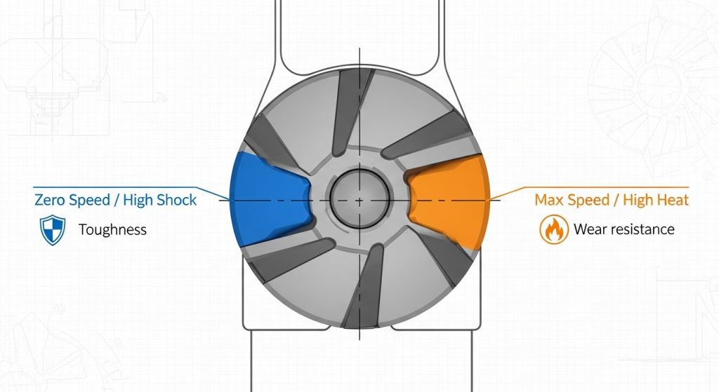 - The Central Insert: Cuts at near-zero surface speed (at the very center). It deals with crushing forces and needs Toughness.