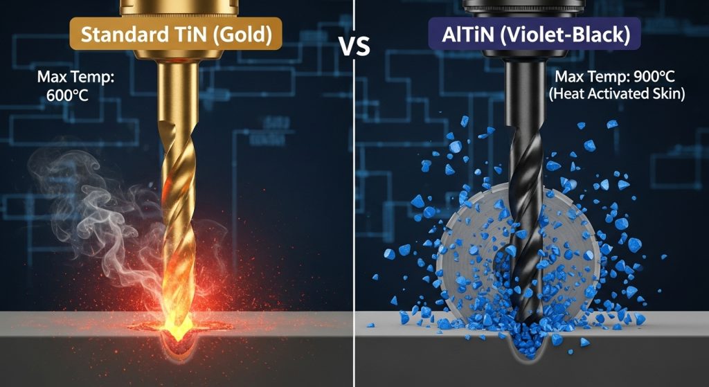 If you are running high-speed machining (HSM) operations on materials above 45 HRC, AlTiN or its variant TiAlN (Titanium Aluminum Nitride) are your best options. They prevent the heat from reaching the carbide substrate. This is critical when you are learning how to drill hardened materials.