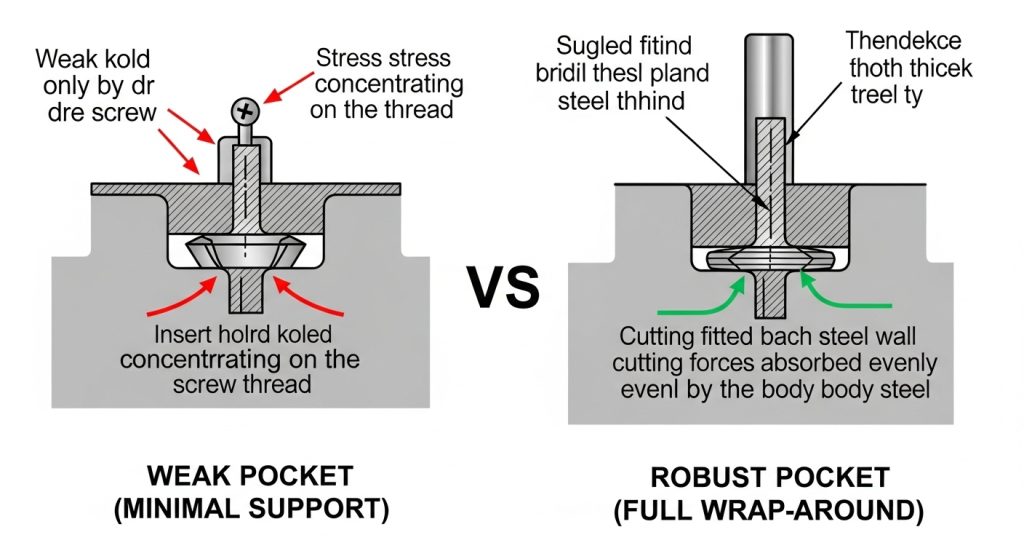 Look at how much steel supports the back of the insert. A “Robust Pocket” wraps around the insert, absorbing the thrust load. A “Weak Pocket” leaves the insert unsupported, leading to vibration and micro-fractures.