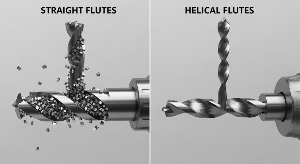 Helical flutes are twisted around the body, helping to mechanically lift chips out of the hole, which is critical for deep drilling. Straight flutes are linear and rely mostly on coolant pressure to flush chips, which is usually sufficient for short (2xD) holes but risky for deeper applications.