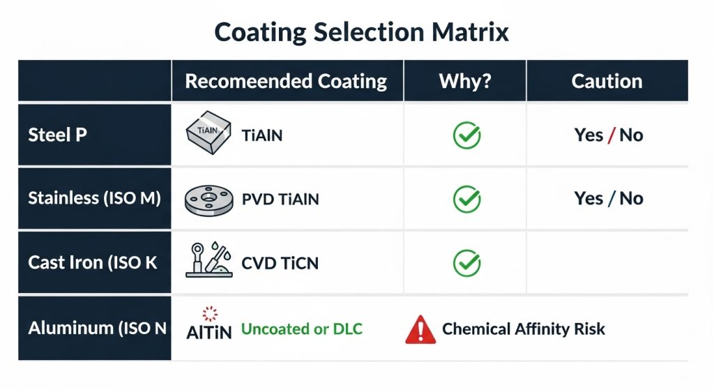 For stainless steel (ISO M), a PVD TiAlN (Titanium Aluminum Nitride) coating is generally the best choice. PVD allows for a sharper cutting edge which is crucial to shear stainless steel and prevent work hardening. Avoid thick CVD coatings as they can be too dull for these gummy materials.