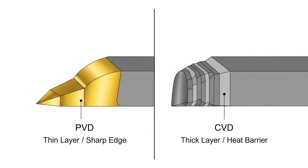 Quick Answer: PVD is processed at lower temperatures (~500°C). It creates a thin, smooth layer that hugs the insert’s geometry perfectly.