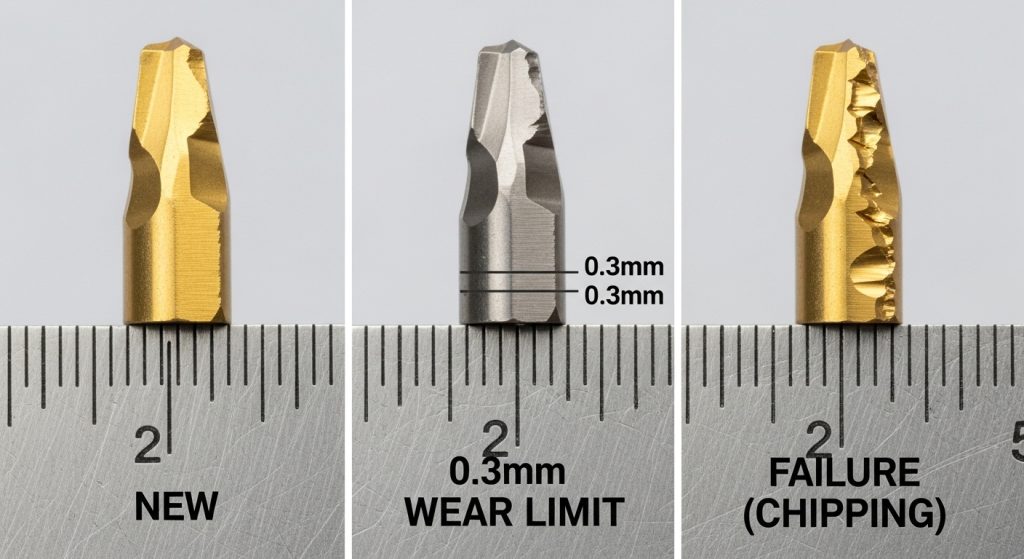 The industry standard for retiring an indexable drill insert is based on Flank Wear (VB). As the insert cuts, the abrasive action of the metal wears down the cutting edge, creating a flat “land” on the side of the insert.