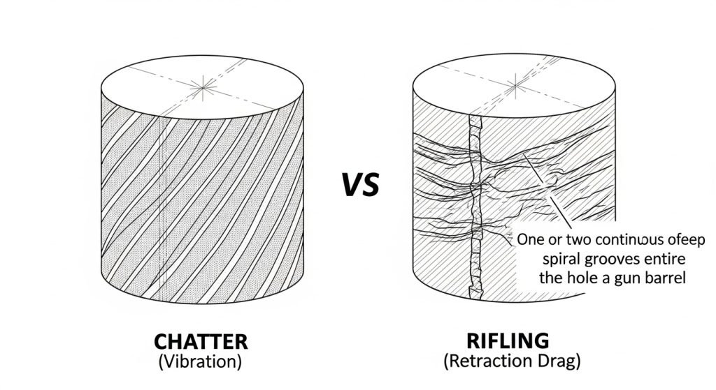 Surface finish tells a story. It is the signature of the cutting forces, temperatures, and mechanics occurring inside the hole. By learning to distinguish between the vibration of chatter, the drag of retraction, and the cloudiness of BUE, you can stop guessing and start engineering a solution.