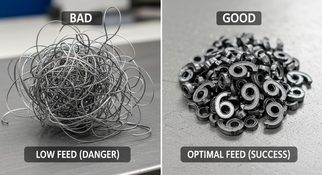 - Long, Stringy Chips: The feed is too low. The chip is too thin to break under its own weight. Action: Increase feed rate.