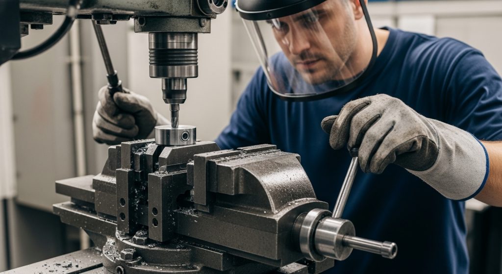 To drill hardened metal safely, secure the workpiece rigidly, use a carbide spot drill to create a pilot, and apply consistent coolant. Wear full face protection, as hardened chips are razor-sharp and hot. Drill with steady pressure, avoiding dwell, and peck only if chips become impacted in the flutes.