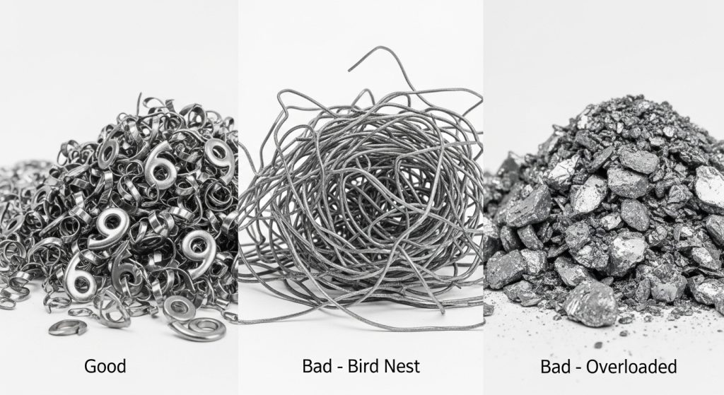 - Danger: Long, stringy bird nests. These wrap around the tool body, blocking coolant and causing catastrophic heat buildup.