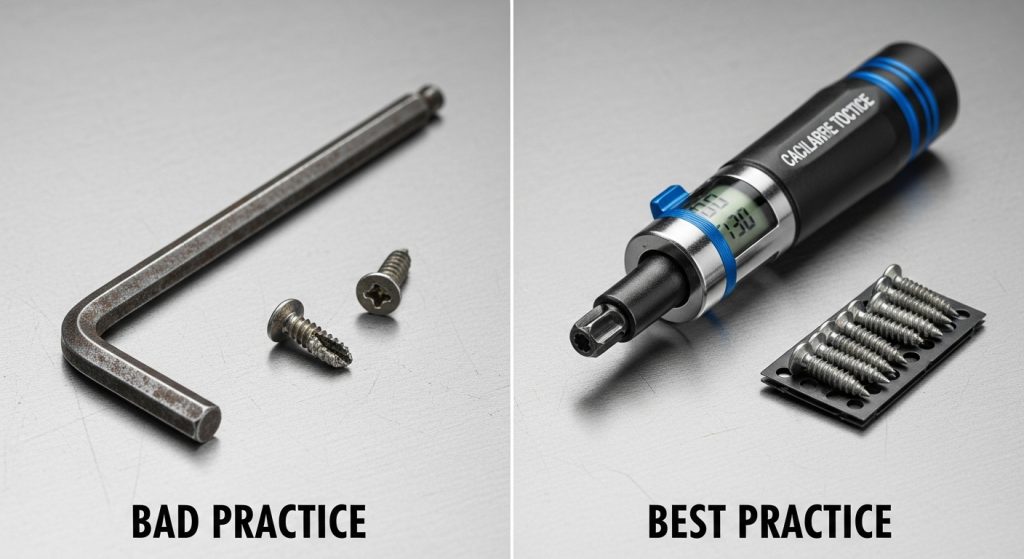 Using a preset torque driver (matching the manufacturer’s spec, typically 0.6Nm to 4.0Nm depending on screw size), tighten the screw in one smooth motion until the driver clicks. Do not “double click” or jerk the tool.