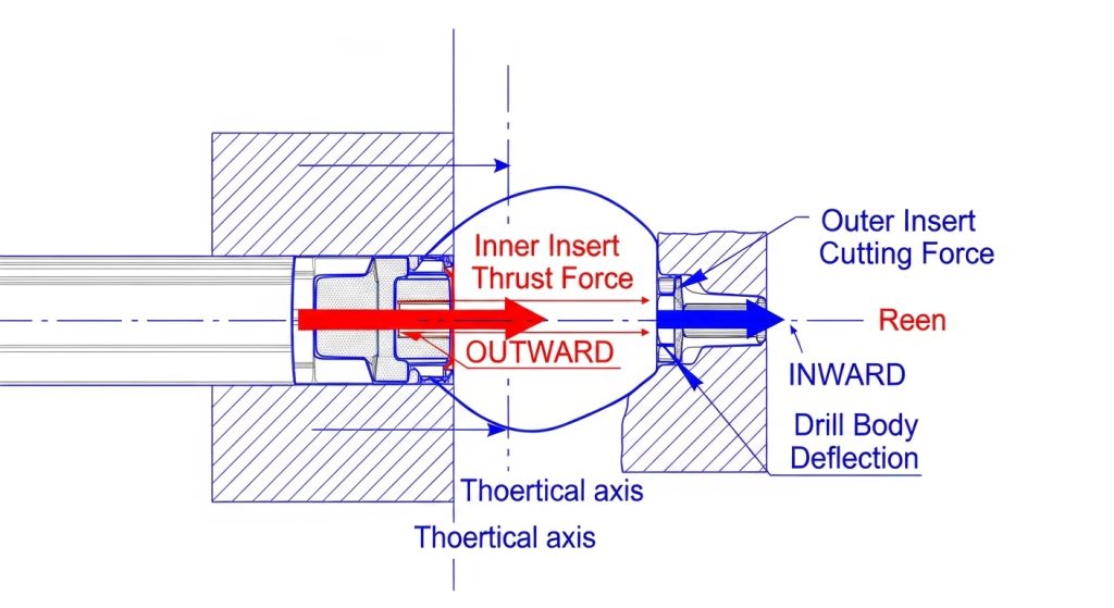 If your geometry is “unbalanced”—meaning the chip breaker or rake angle on the inner insert generates significantly more force than the outer one—the drill will deflect. This deflection is what causes: