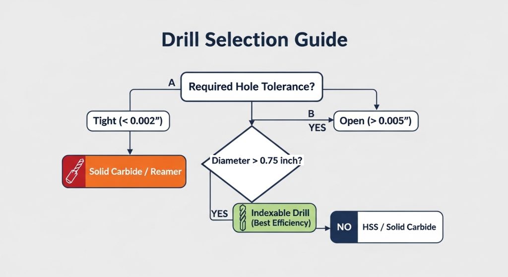 - High Tolerance Requirements: Indexable drills are not reamers. They are generally “roughing” tools. Expect tolerances around +/- 0.005″ to 0.010″. If you need a press-fit dowel hole, use the indexable drill to remove the bulk of the material, but finish with a boring bar or reamer.