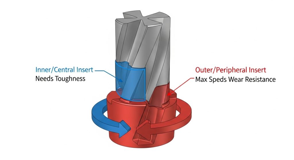 It depends on the drill body design, but generally, it is better to optimize. Use a tougher, shock-resistant grade/geometry for the center (where speed is low) and a wear-resistant, harder grade for the periphery (where speed is high).