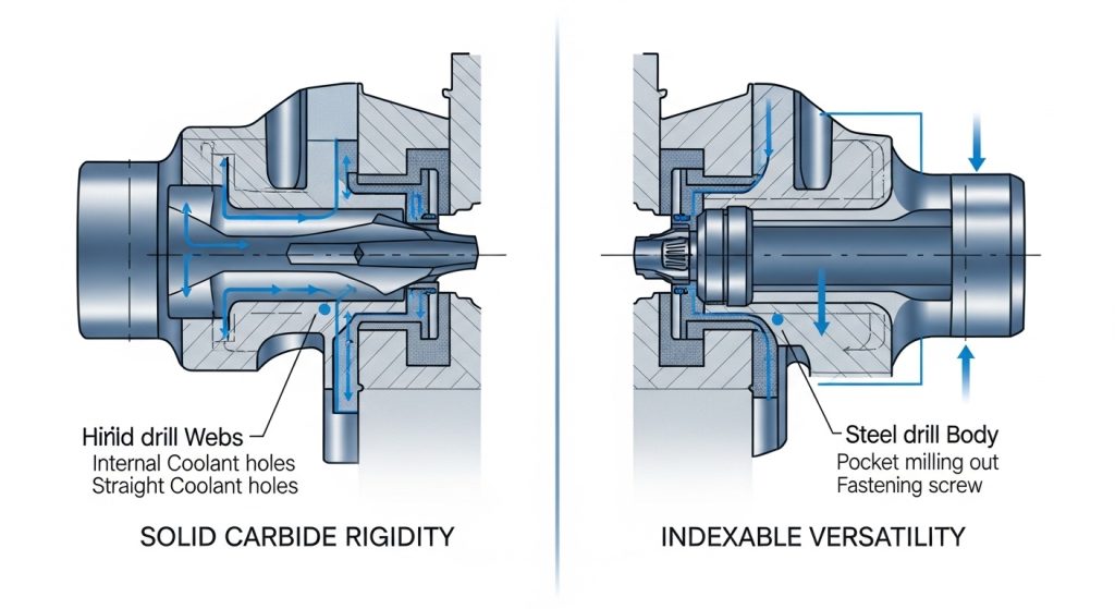- Scenario D: Deep Holes ($>5\times D$): Solid Carbide. Indexable drills lose stability fast as they get longer.