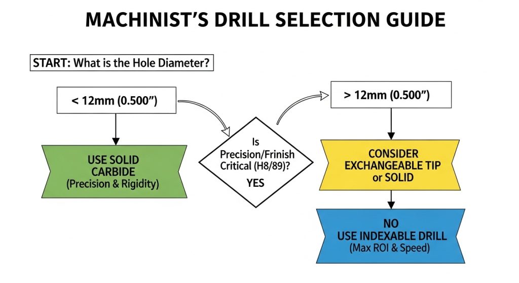 - Scenario C: High Volume / Loose Tolerance: Indexable. This is the sweet spot. Drill it fast, index the inserts, keep the spindle turning.