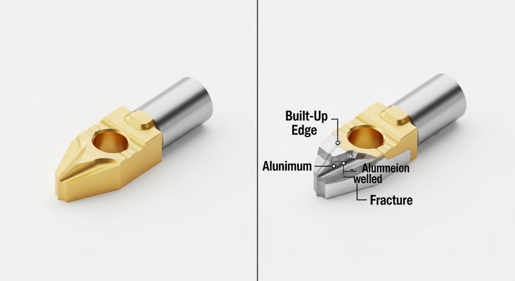 This occurs when material welds itself to the cutting edge. It is rampant in “gummy” materials like aluminum, low-carbon steel, and stainless steel. The welded material alters the geometry of the tool, eventually causing the edge to chip away.